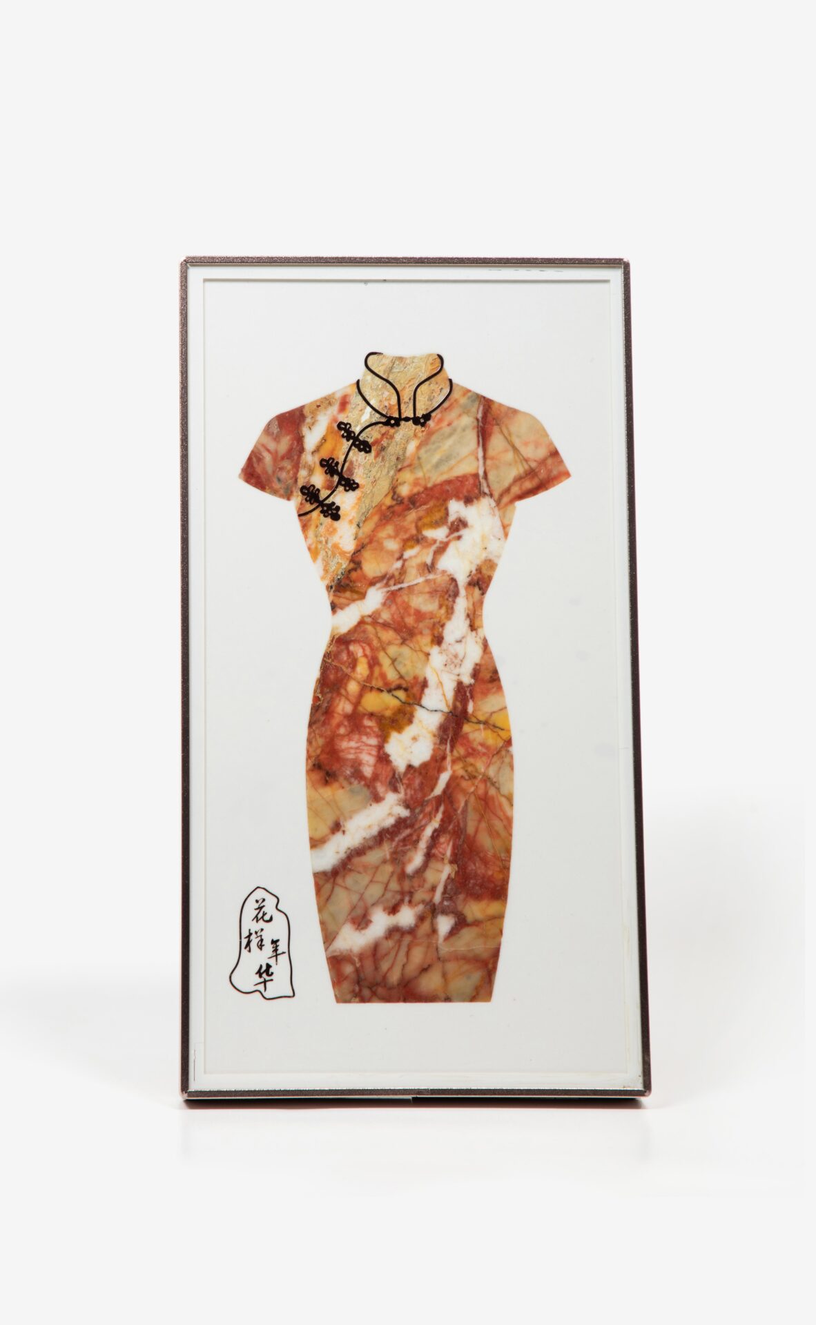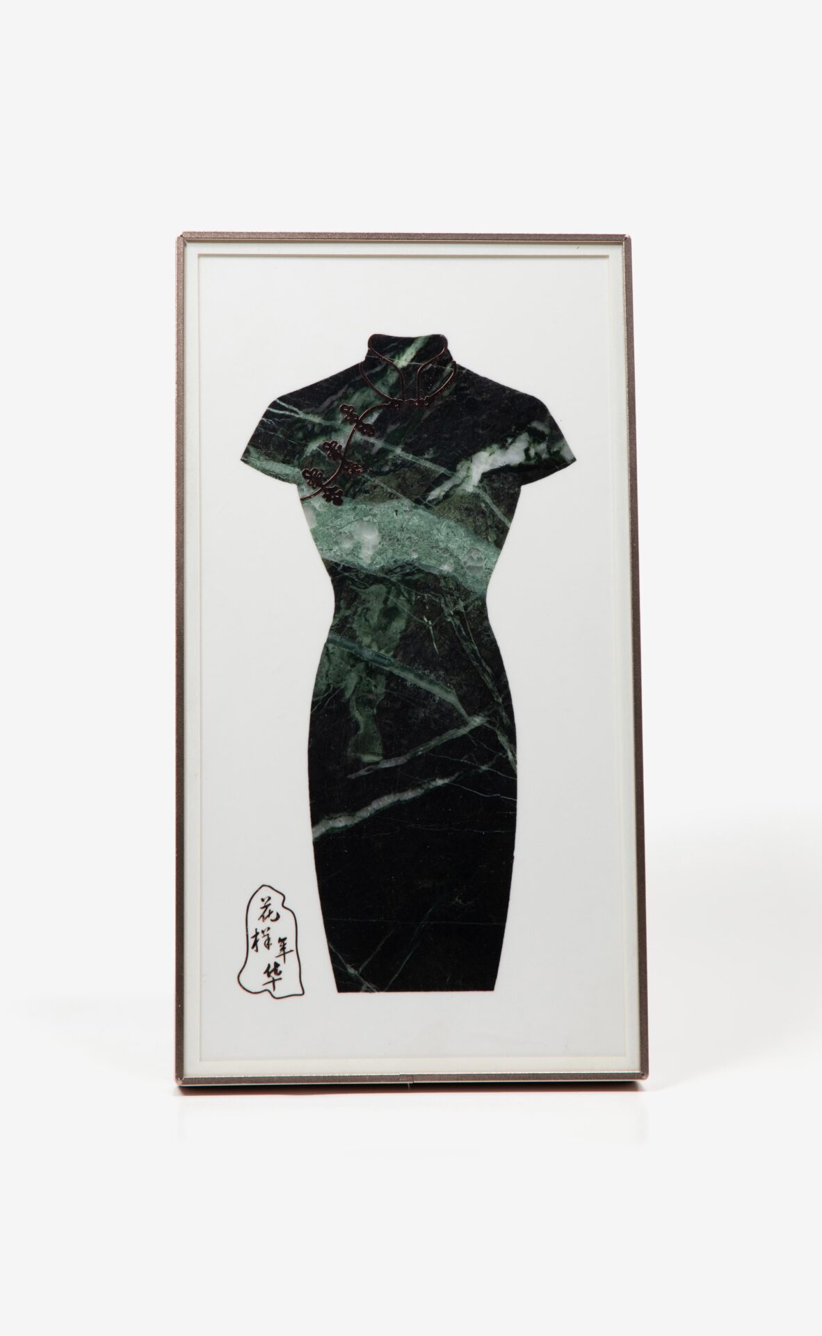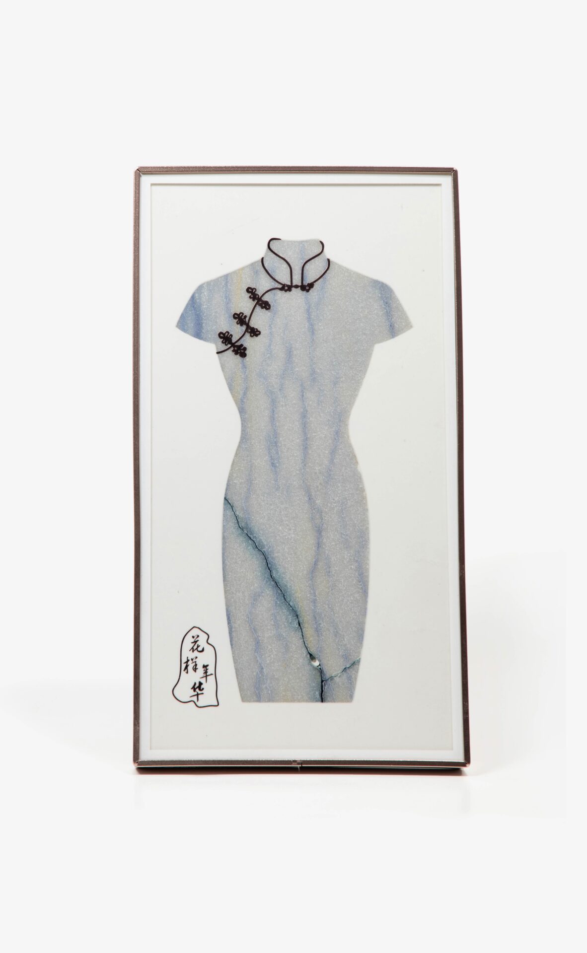 Waterjet-Cut Chinese Cheongsam Dress from Natural Marble Mosaic, Luxury Stone Wall Art with “Blooming Years” Calligraphy