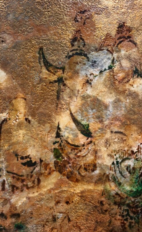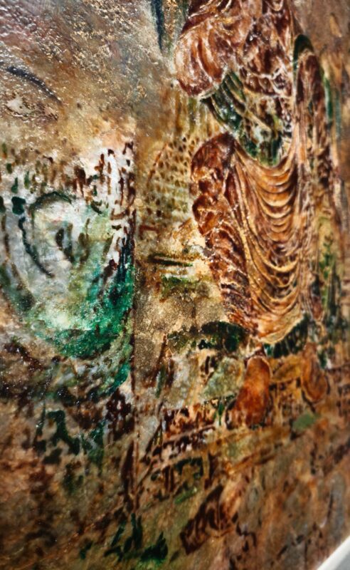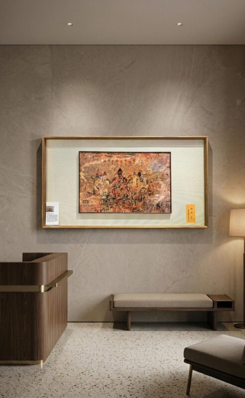 This piece transforms ancient mural fragments into contemporary contemplation—marble and lacquer, gold and time, art and impermanence.